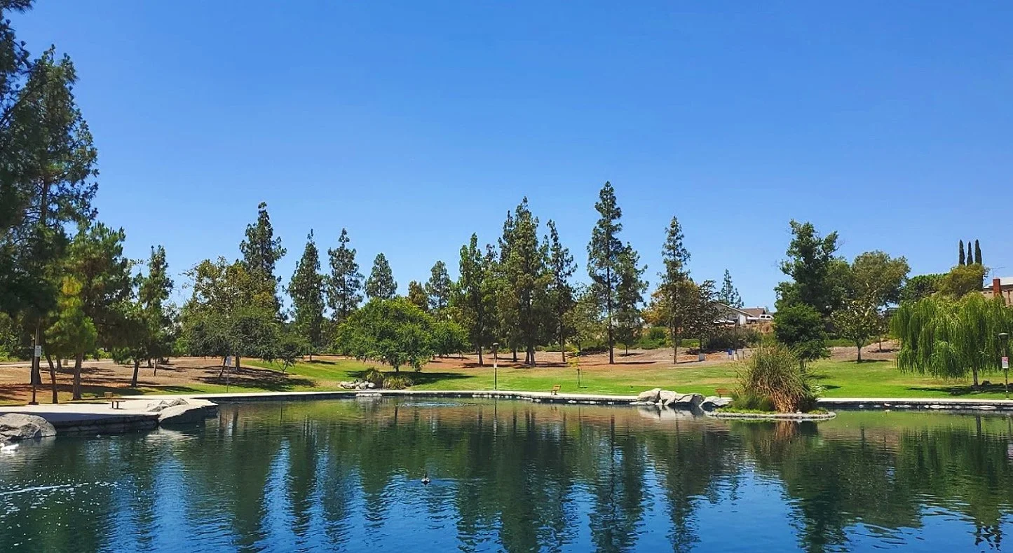 Open park with hills and a pond